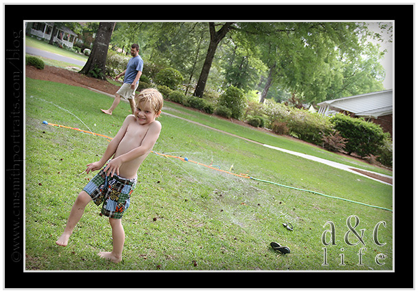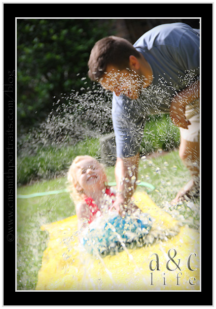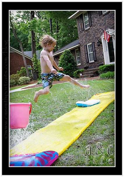 And then today. Both kids were up way too late last night so we knew that staying outside all day long would be the key to avoiding meltdowns. Out came the slip-n-slide for the first time this year!!