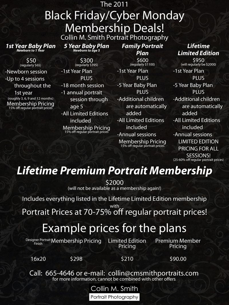Or maybe we should call it Black December because this special is going to last throughout this month. But Black December sounds kind of gloomy and depressing so we won’t go there…just know that you can take advantage of all of these AMAZING deals for the entire month. After we launched the sale Collin and I quickly realized that we would be entirely too busy over the weekend with Christmas sessions to keep up with it. So, there it is…the {Black?} December Special. Spread the word, people!! Tell your friends and family. I’m getting ready to let you in on some NEVER BEFORE OFFERED ways that you can save money on portraits of the ones that you hold closest to your heart. BIG deals. Here we go: