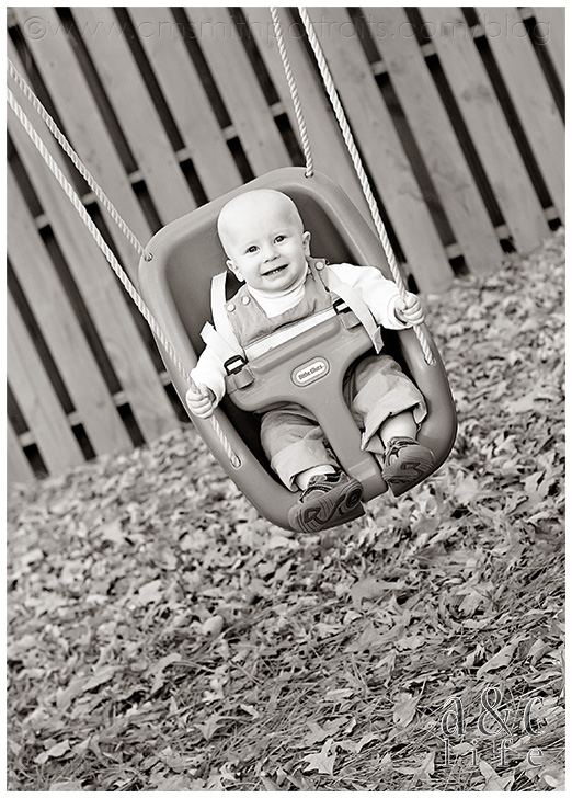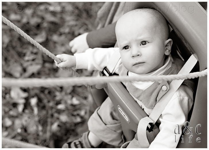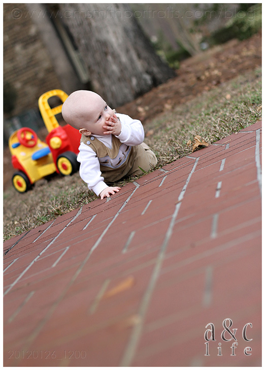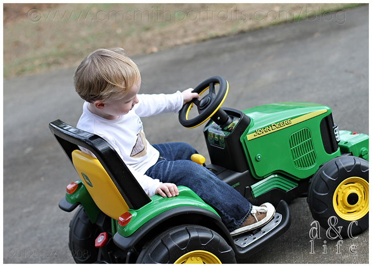 When I arrived they were already happily playing in the front yard…Derrick on his tractor, Henry making a beeline for the steps and eating leaves. 😉