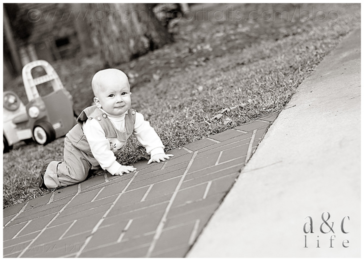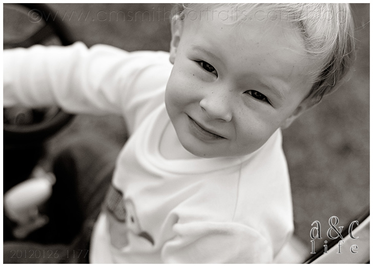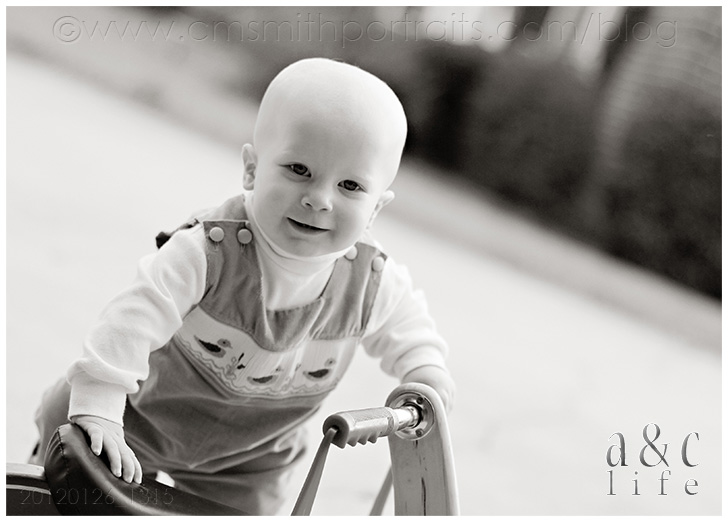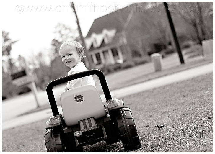 When I arrived they were already happily playing in the front yard…Derrick on his tractor, Henry making a beeline for the steps and eating leaves. 😉