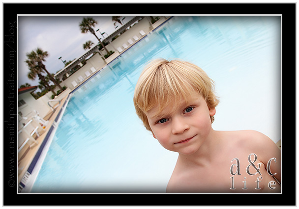 The actual birthday party was held Sunday night and wasn’t exactly a kid friendly thing, so I stayed with them in the hotel. For that reason we decided to find something on the beach with a great pool. Because it’s always sunny and at least 80 degrees in Florida, right? I would lounge by the pool while the kids played happily in the water and Collin attended the party. I could see it in my head. It was beautiful. They would play themselves silly and immediately fall into a deep, blissful sleep when I took them back to the hotel room. Doggone if it wasn’t 59 degrees and RAINING all day on Sunday. We did manage to get a few short minutes to enjoy the resort before the downpour began.