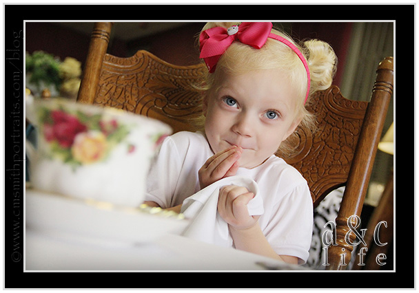 I’ve been reading this GREAT book, “Bringing Up Girls” by James Dobson. Collin and I read “Bringing Up Boys” when Mak was a toddler and vowed we would re-read it every year. Of course, we haven’t. Recently he came out with “Bringing Up Girls” and it is just as good as it’s counterpart. I am racing through it so Collin can read it, and then we plan on re-reading the boy version again, too. Anyway, one of the things he talks about in the book is the importance of little girls learning manners and also having special “Mommy/Daughter” things that are just for the two of you. One of my favorite things to do with Clara Beth is to have special “Ladies Only” lunches. And her favorite place to go for this is Top Hat Tea Room. She loves it ’cause it’s pink. VERY PINK. 🙂