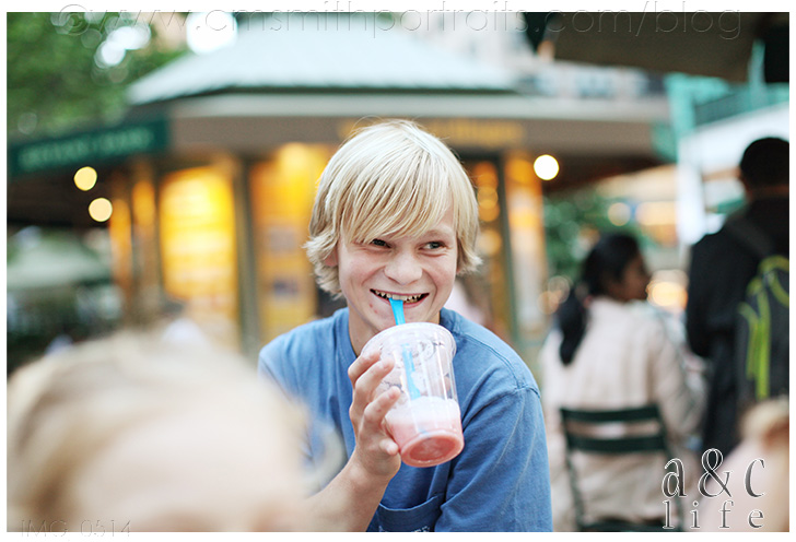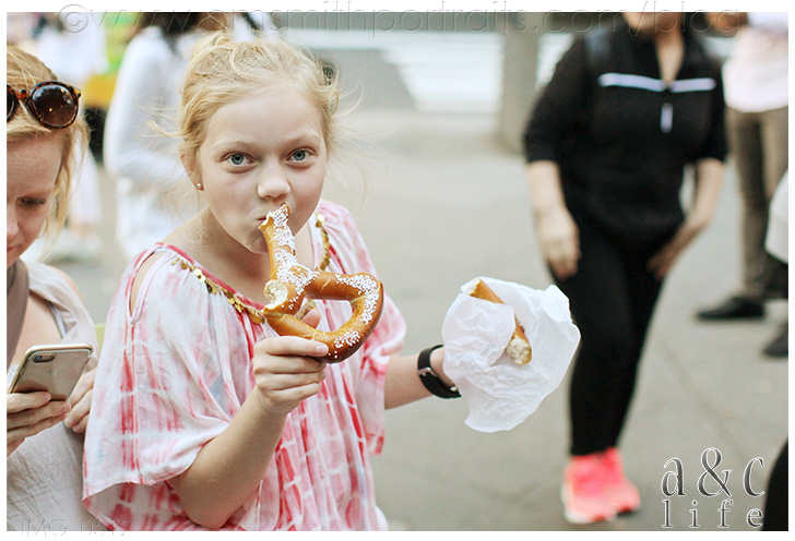We stayed there for awhile and then headed off to find our last New York snacks. A giant pretzel for CB and a smoothie for Mak.