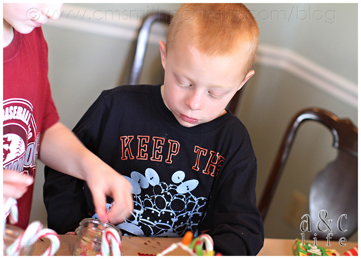 This year, like last year, there was no real planning or scheming involved. We simply bought the little Aldi kits and a few extra bags of candy and let them go at it. This year, they’re really all still pretty little. Even the oldest one is still young enough to have a hot chocolate mustache. But I will say that we saw some small improvements in building over last year, showing that they are in fact…getting older. The boys constructed a car out front of their house this year. The girls made a tire swing in their side yard. Well, the older boys and older girls. The two babies were more interested in shoveling sweets into their little mouths as fast as they could. It was a fun afternoon. =)