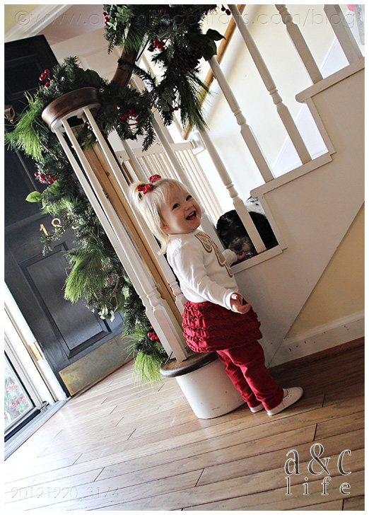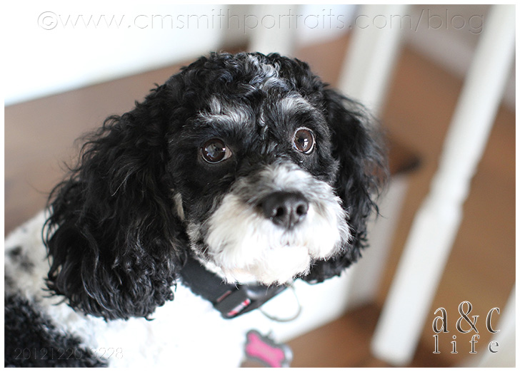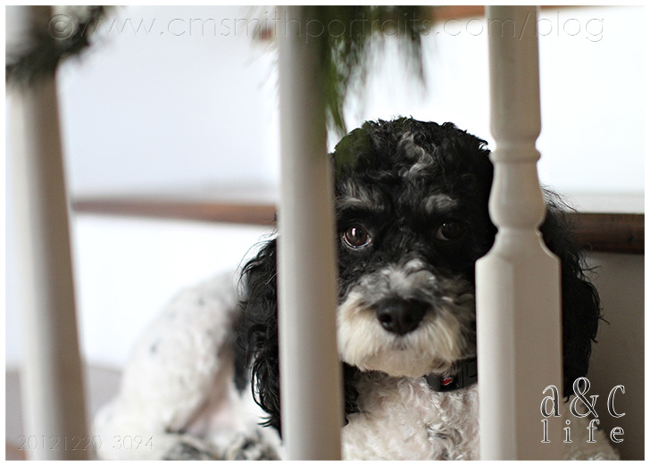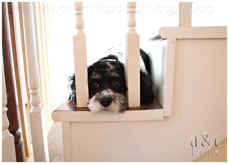 Poor Em was sequestered on the stairs due to an animal hospitalization that occurred earlier in the month. NO people food for this pup.