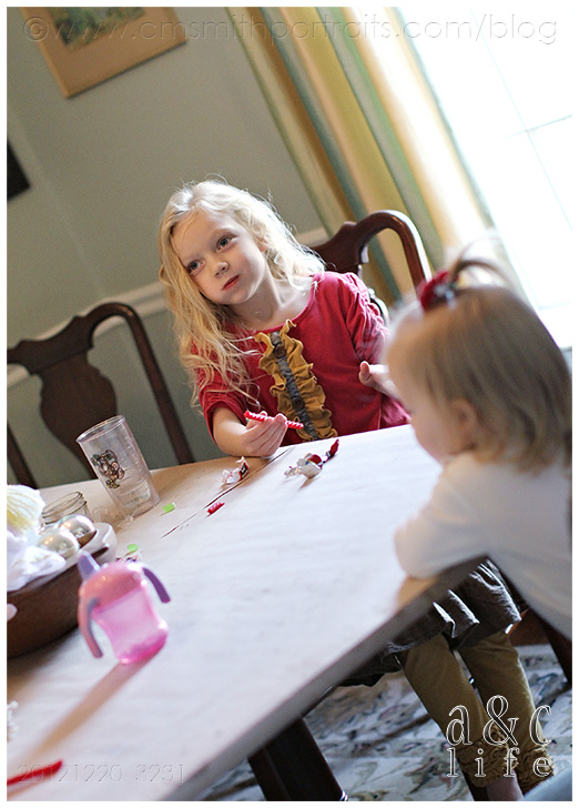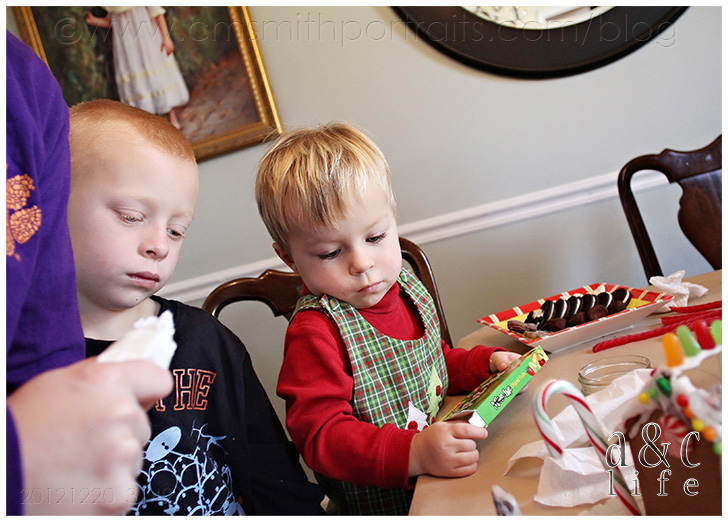 This year, like last year, there was no real planning or scheming involved. We simply bought the little Aldi kits and a few extra bags of candy and let them go at it. This year, they’re really all still pretty little. Even the oldest one is still young enough to have a hot chocolate mustache. But I will say that we saw some small improvements in building over last year, showing that they are in fact…getting older. The boys constructed a car out front of their house this year. The girls made a tire swing in their side yard. Well, the older boys and older girls. The two babies were more interested in shoveling sweets into their little mouths as fast as they could. It was a fun afternoon. =)
