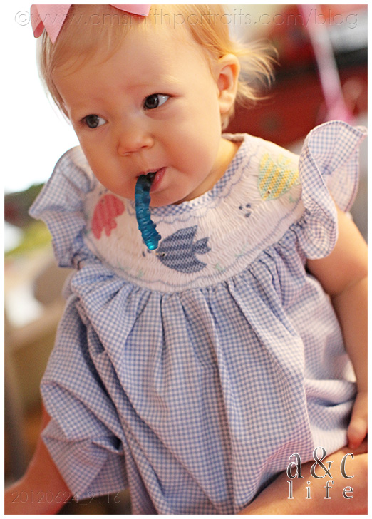 No, we obviously did not let the one year old eat a gummy worm. Funny pic, though, right? Gracious, she’s CUTE!