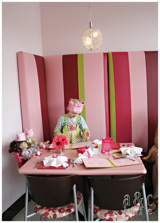 He really was a good sport, though. He loves his sister. =) Before long it was time for our Bistro reservation, but we had to make a stop at the ladies’ room. Oh my Stars, y’all they have a place for the dolls in the bathroom. Craziness.