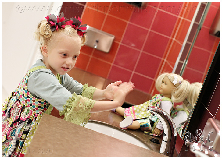 He really was a good sport, though. He loves his sister. =) Before long it was time for our Bistro reservation, but we had to make a stop at the ladies’ room. Oh my Stars, y’all they have a place for the dolls in the bathroom. Craziness.