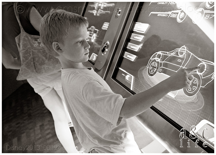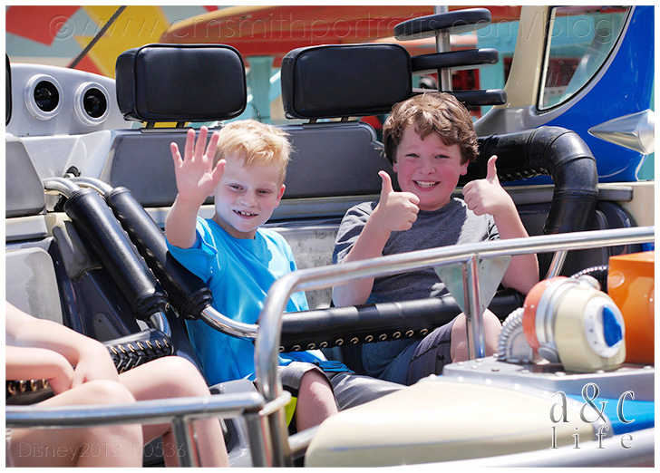 Day 2…EPCOT!! In the RAIN!!! =) We did a little Test Track and Soarin’ while we waited on the Otts to arrive. Do you like the new Test Track? I kind of miss the older one. Mak loves designing his car, though.