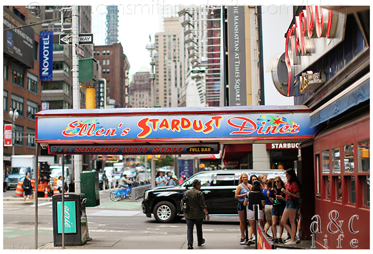 We were completely wiped out at this point and in need of food, so we headed to Ellen’s Stardust Diner hoping to get in. They don’t take reservations, but since it was an off time to eat (3:00) we were able to walk right in! Come to think of it, we didn’t wait for any meal while we were in New York.