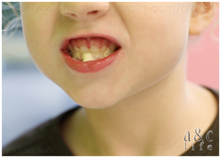 Bittersweet. I was so excited when Mak lost his first baby teeth. He was SO Stinkin’ CUTE with a giant hole in his mouth where four teeth once resided. But CB’s baby teeth are the LAST baby teeth in this house. So, I’m not as excited to see them go. It happens too fast. I do think that little gap is pretty sweet, though.