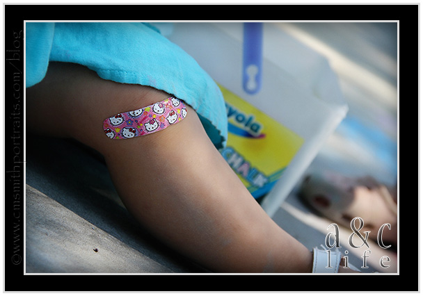 Sweet Caroline received her first boo-boo that required a band-aid at Aunt Aron’s house yesterday. 🙁