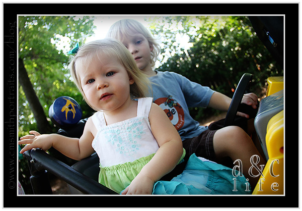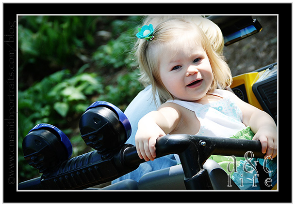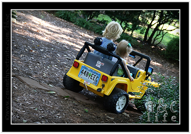 I haven’t been sharing a lot of our family photographs lately, so here are a few from recess yesterday. Sweet Caroline is back with us on Mondays (YAY!!) and yesterday was her first ride in the jeep! Don’t worry, the jeep was in the slow mode and her seatbelt was securely fastened at all times. And Aunt Aron was well within baby catching distance. 🙂 She had a BLAST.