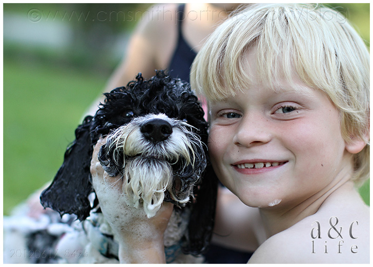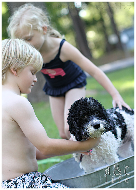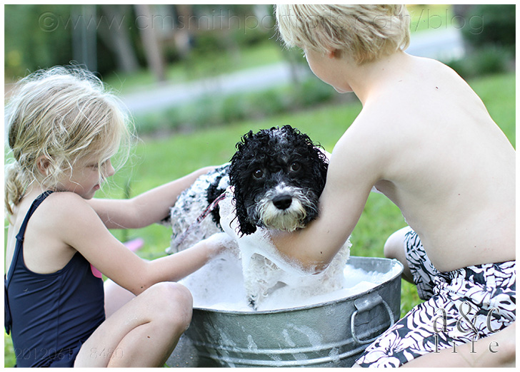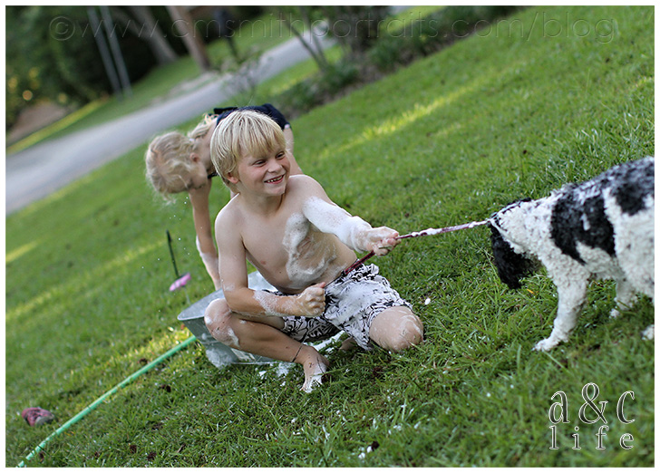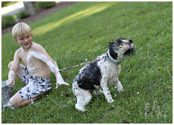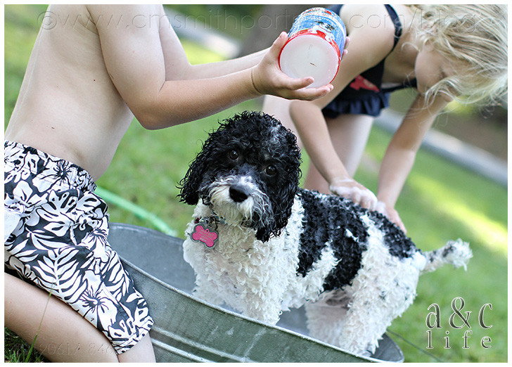 We’re decorating our photo tree tonight and I’m loving going through all of our pictures from the past year. I’m going to try to do a post that has more info on the photo tree because lots of y’all have been messaging asking about it. But first, I had to document these pictures in a post. I had completely forgotten about this Sunday afternoon in July until I was going through looking for photos for the tree. They made me smile so I knew I needed to record the memory in my baby book (this blog). So here you go…Mak and CB’s pet grooming service. =)