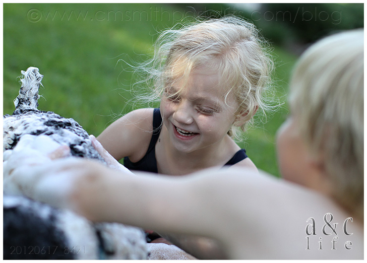 And then this one. Little turkey sees a hose and decides he knows what to do with it. Sister is completely oblivious, just enjoying being in the dirty dog water. Yes, he was told this was inappropriate and to quit. Yes, Collin and I laughed. I love being a parent. They make life better. =)