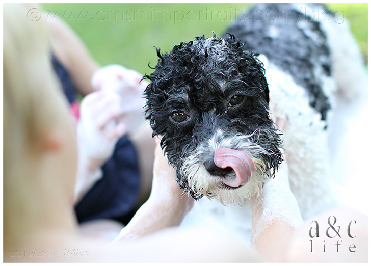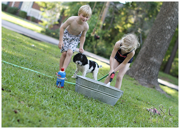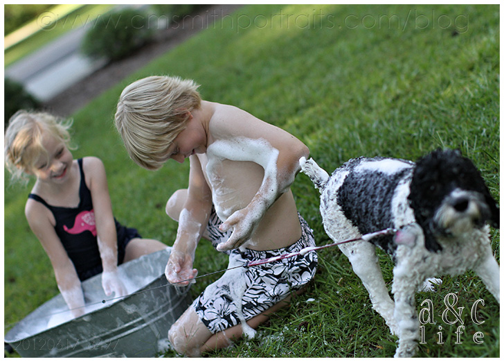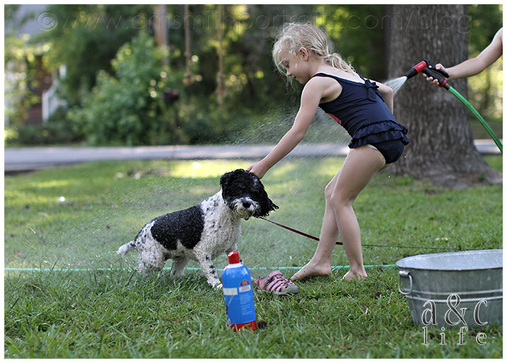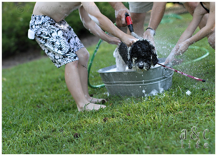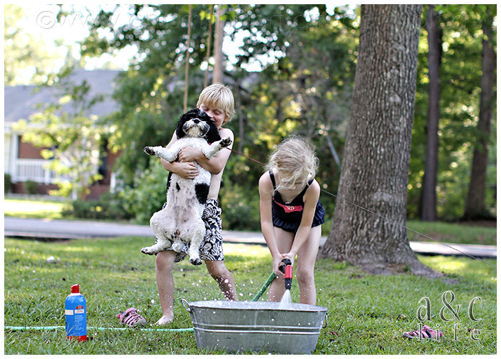 We’re decorating our photo tree tonight and I’m loving going through all of our pictures from the past year. I’m going to try to do a post that has more info on the photo tree because lots of y’all have been messaging asking about it. But first, I had to document these pictures in a post. I had completely forgotten about this Sunday afternoon in July until I was going through looking for photos for the tree. They made me smile so I knew I needed to record the memory in my baby book (this blog). So here you go…Mak and CB’s pet grooming service. =)