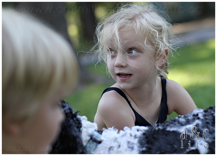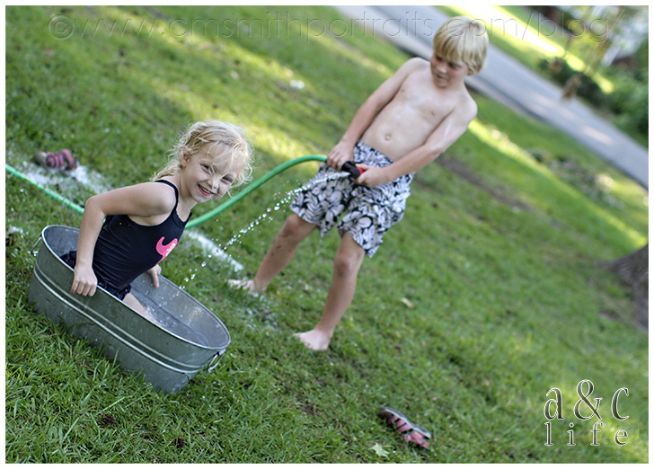 And then this one. Little turkey sees a hose and decides he knows what to do with it. Sister is completely oblivious, just enjoying being in the dirty dog water. Yes, he was told this was inappropriate and to quit. Yes, Collin and I laughed. I love being a parent. They make life better. =)