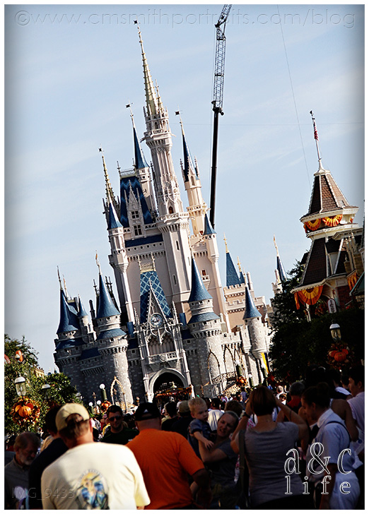 Before we knew it we were through the tunnel and the castle was in our line of sight. The Crane. GRRRRRRR. I’m tempted to dig through the bazillion Disney photos on our hard drive and find a crane-less photo.